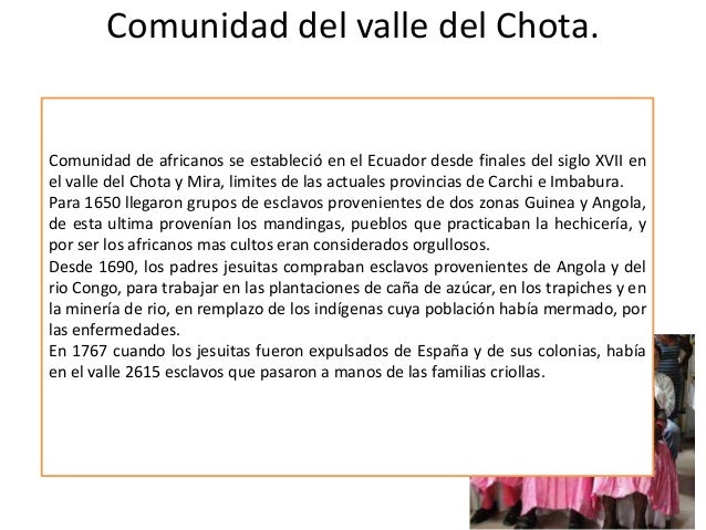 2. 3. Comunidad del valle del Chota. Comunidad de africanos se estableció en el Ecuador desde finales del siglo XVII en el valle del Chota y Mira, limites de las actuales provincias de Carchi e Imbabura. Para 1650 llegaron grupos de esclavos provenientes de dos zonas Guinea y Angola, de esta ultima provenían los mandingas, pueblos que practicaban la hechicería, y por ser los africanos mas cultos eran considerados orgullosos. Desde 1690, los padres jesuitas compraban esclavos provenientes de Angola y del rio Congo, para trabajar en las plantaciones de caña de azúcar, en los trapiches y en la minería de rio, en remplazo de los indígenas cuya población había mermado, por las enfermedades. En 1767 cuando los jesuitas fueron expulsados de España y de sus colonias, había en el valle 2615 esclavos que pasaron a manos de las familias criollas.